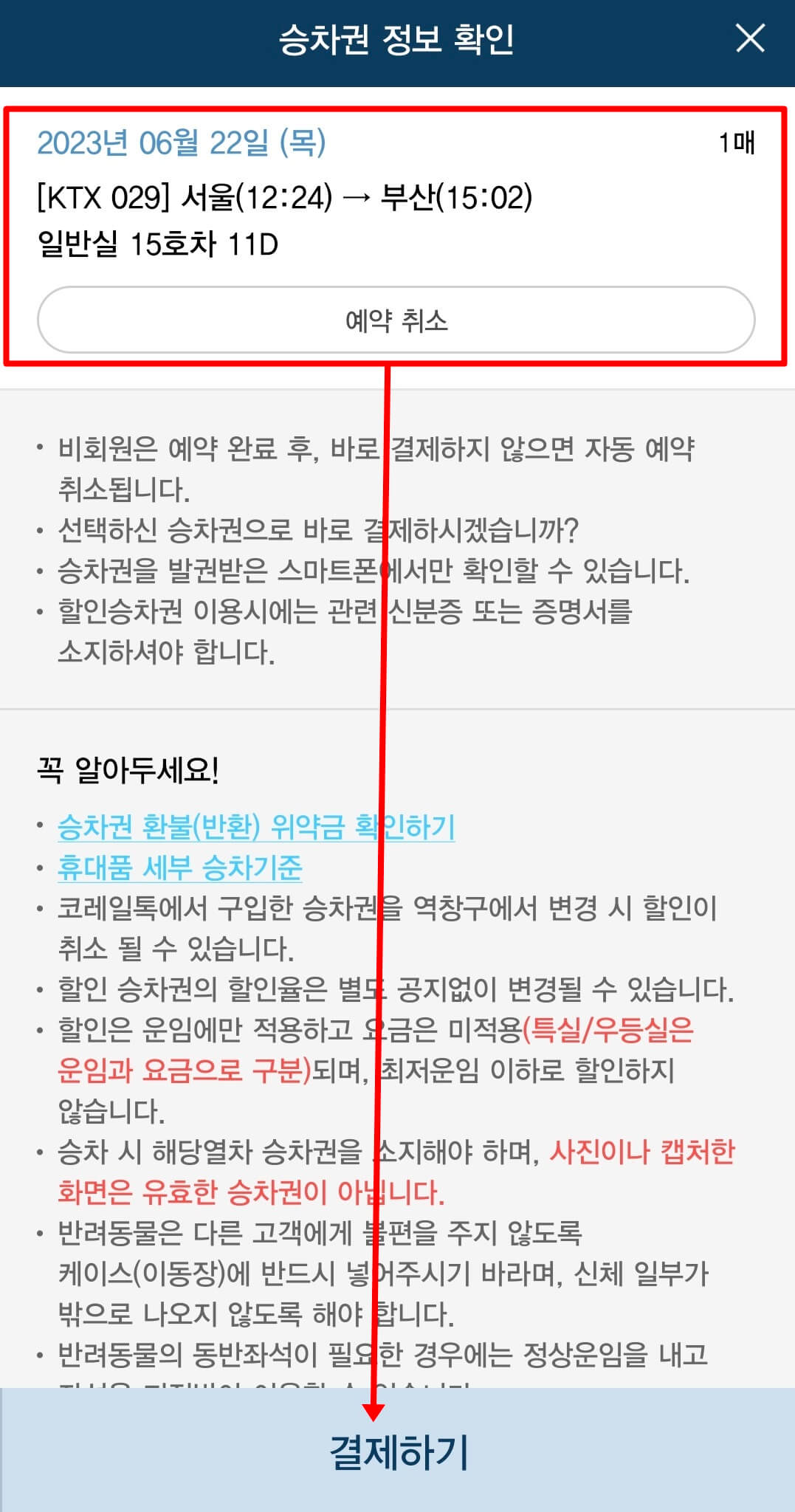 6. 승차권 정보를 확인 후 결제하기를 클릭합니다.