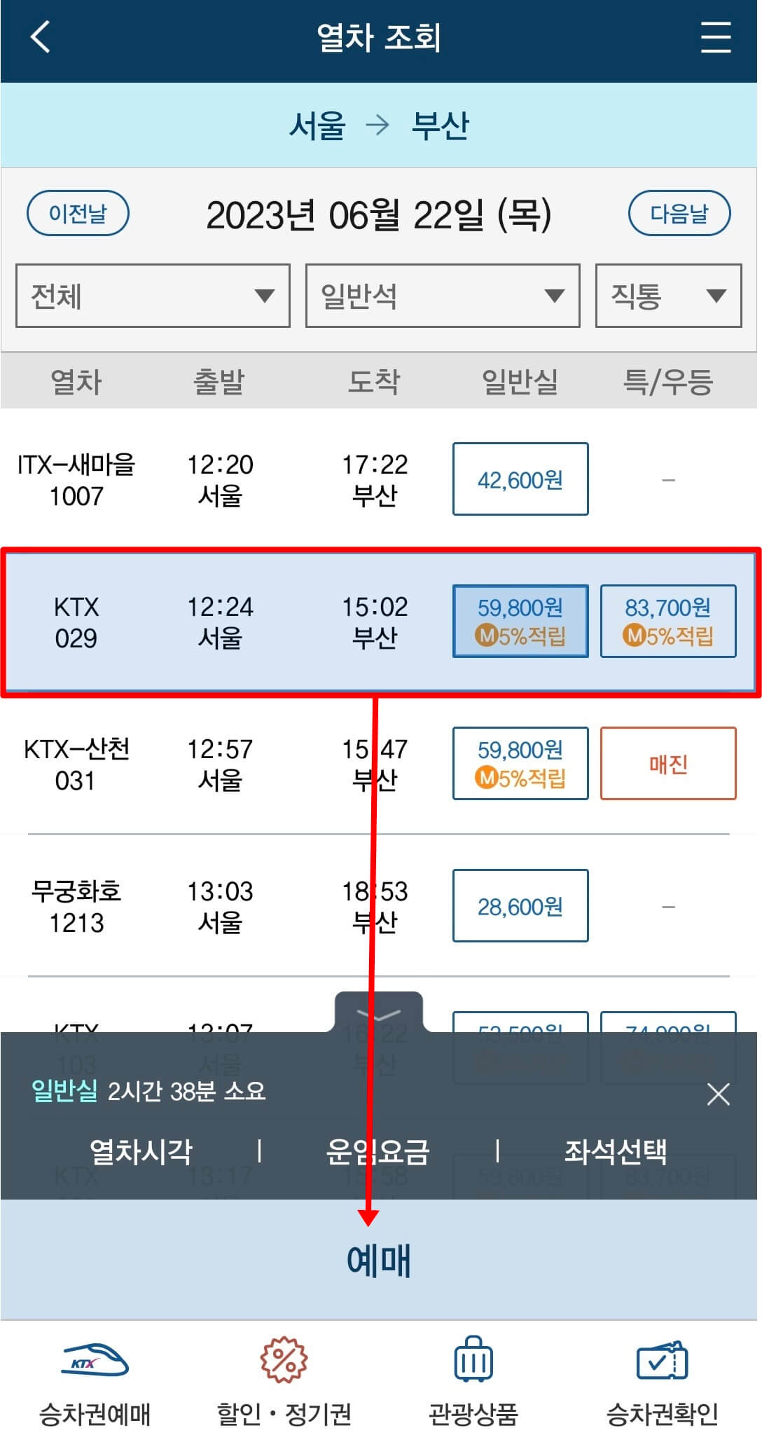 3. 원하는 열차를 선택 후 예매를 클릭합니다.