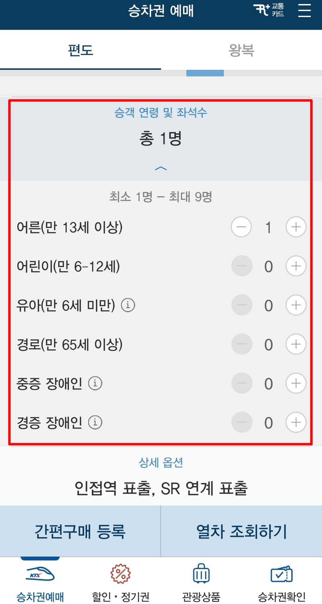 2. 승객 연령 및 좌석수를 선택 후 열차 조회하기를 클릭합니다.