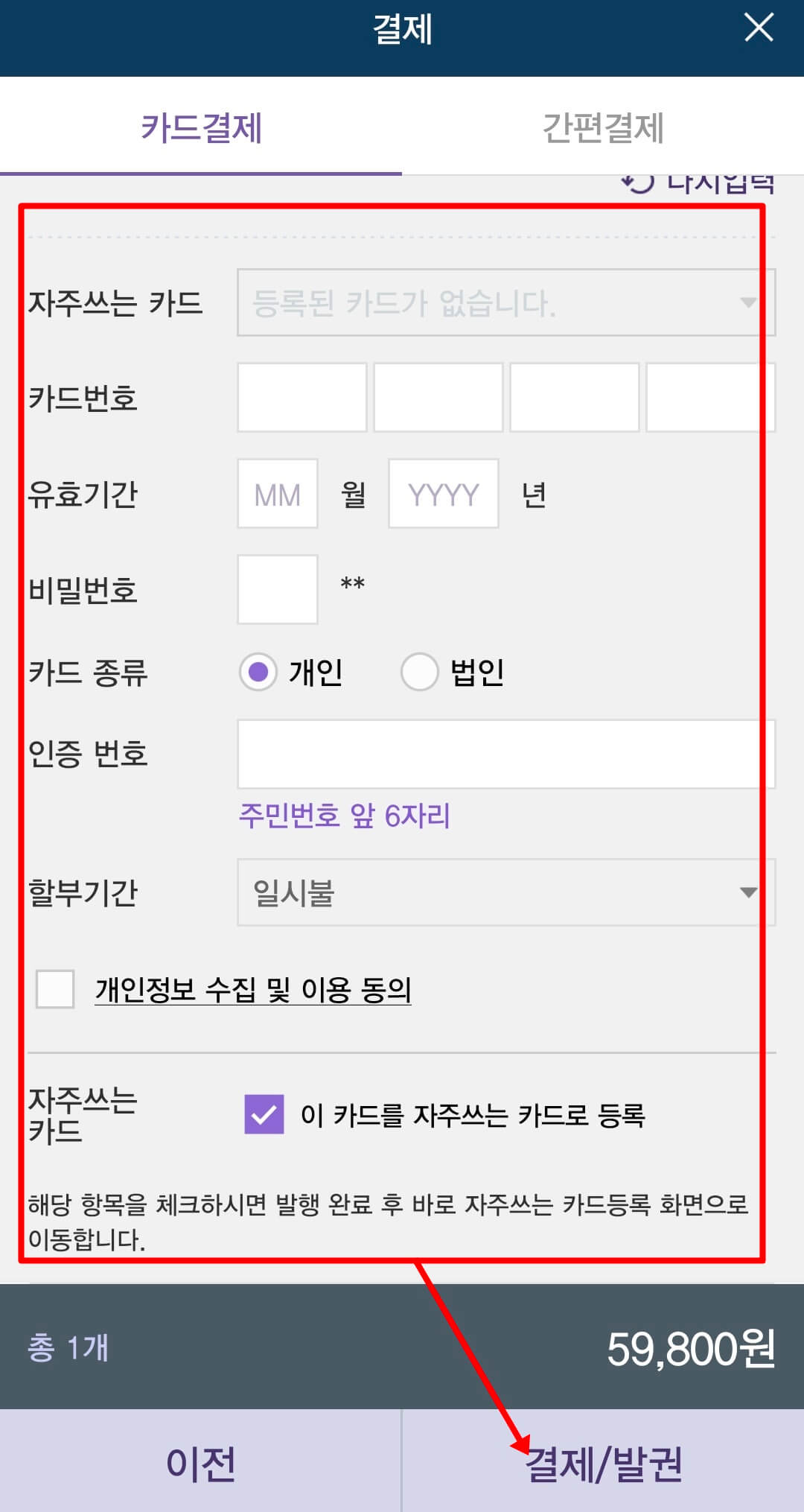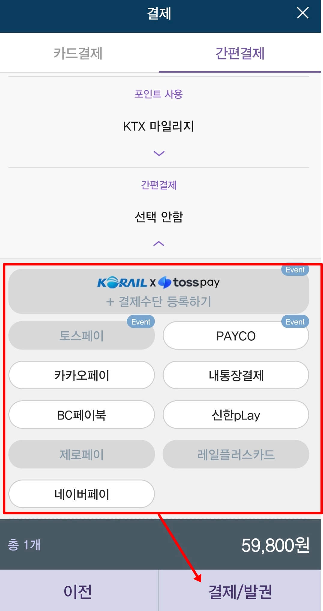 8. 간편결제 또는 카드결제 중 원하시는 결제를 선택 후 결제 및 발권을 진행하시면 됩니다.