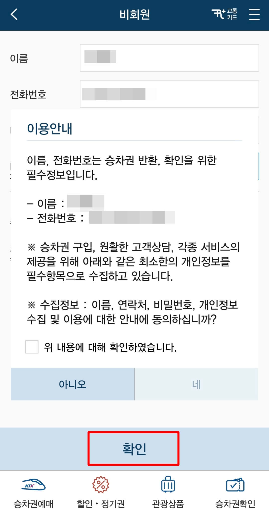 5. 개인정보가 맞는지 확인 후 확인을 클릭합니다.
