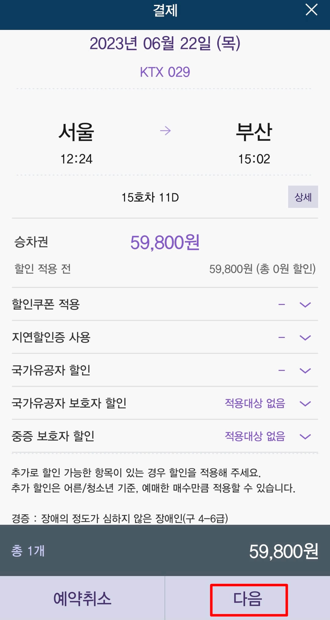 7. 예매내용이 맞는지 다시한번 확인 후 다음을 클릭합니다.