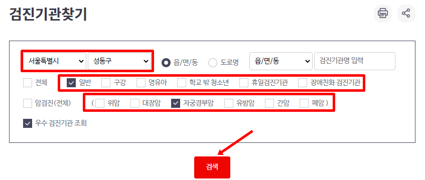 건강검진을 예약을 위해 건강검진 홈페이지 검진기관찾기 화면으로 이동 후 본인에게 해당하는 건강검진 항목을 체크합니다.