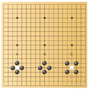⚫들어냄의 규칙 (상대방의 돌을 완전히 포위하면 잡을 수 있다) : 위의 그림에서 A의 경우처럼 흑돌 4개가 백 돌의 활로를 완전히 막으며 포위했을 때는 백돌을 반상에 들어냅니다. 즉, 그림 B의 상태가 됩니다. 이것을 '따냄'이라고 합니다. 이렇게 따낸 백돌은 흑의 포로가 되어 계가를 할 때 백 집을 메우는데 쓰이게 됩니다. C의 그림은 잘못된 둘러쌈이며, 이 경우 백돌을 따낼 수 없습니다.