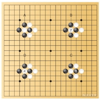 ⚫동형반복의 규칙(패는 바로 되 따낼 수 없다): 위의 그림처럼 흑백이 맞물려 서로 맞 따내는 형태를 하고 있을 때 적용되는 규칙입니다. A의 흑1로 백 한점을 따낸 뒤 곧바로 B의 백2로 흑 한 점을 되 따내는 것을 허용한다면 C와 D의 경우처럼 다시 흑 3, 백 4로 서로 되 따내는 일이 계속 끊임없이 반복됩니다. 그렇다면 바둑이 안 끝나겠게 되므로 그래서 이를 피하기 위해 이러한 규칙이 필요합니다.