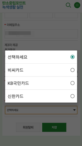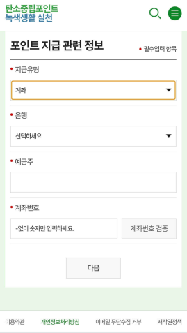 🌱 포인트 지급 관련 정보를 입력합니다. 포인트 지급 유형은 계좌 또는 카드포인트로 선택할 수 있습니다. 카드는 비씨카드, 국민카드, 신한카드 중에서 선택이 가능합니다.